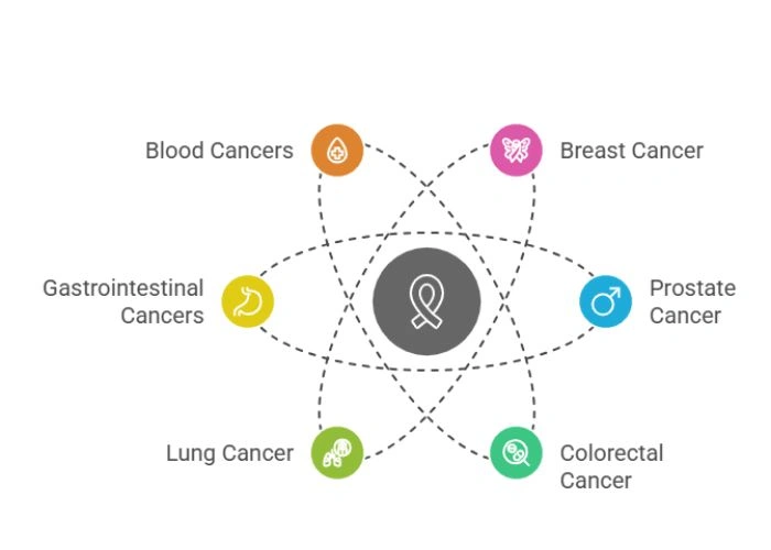 Breast, prostate, colorectal, lung, pancreatic, gastric cancers, and some blood cancers.